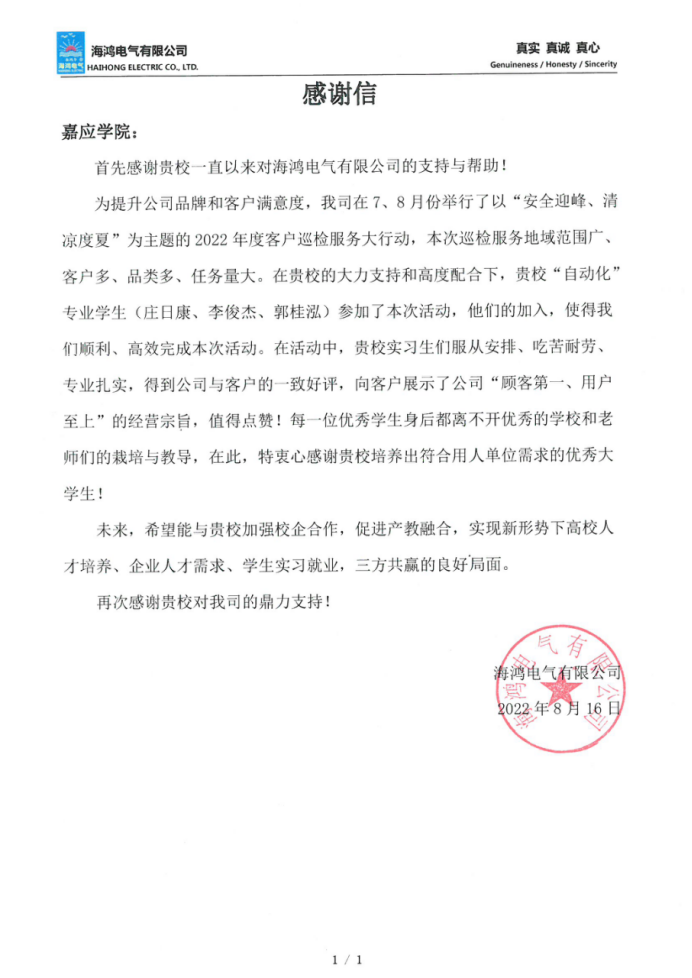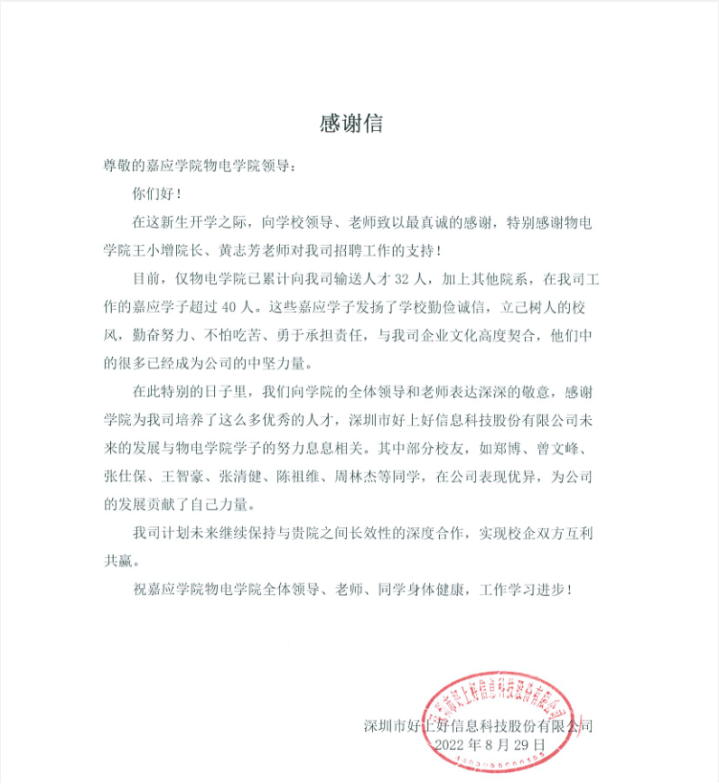 近日,深圳市好上好信息科技股份有限公司、海鸿电气有限公司向我院发来感谢信。信中对我院应、往届毕业生在工作岗位上勤奋努力、不怕吃苦、勇于担责的优秀品质和出色的工作能力表示高度赞赏,诚挚感谢我院为他们公司输送了这么多的优秀人才,表达了与我院开展长效性深度合作的强烈意愿。