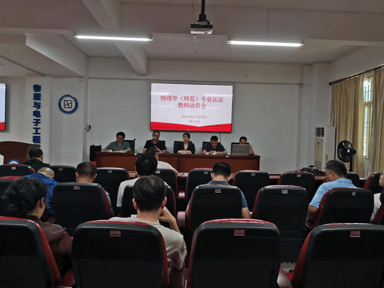 为进一步推进做好物理学(师范)专业认证工作,迎接专家组进校检查,2024年10月9日,我院在何侨生101报告厅召开了物理学(师范)专业认证教师动员会,学院领导班子成员出席本次会议,物理学(师范)专业任课教师、专家联络员、教务秘书、及办公室相关人员参加会议。会议由副院长钟庆湖主持。